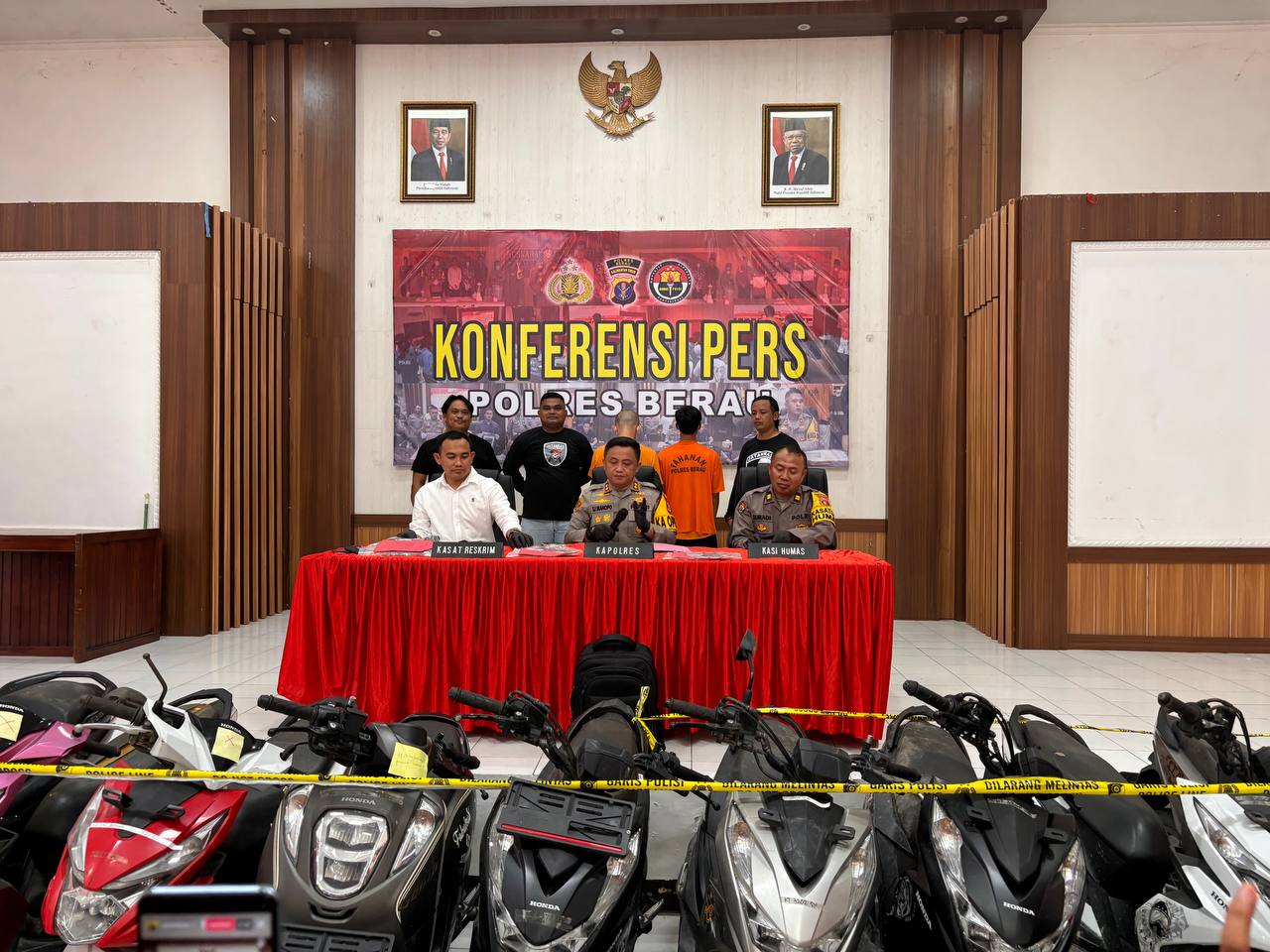 Polres Berau membeber pengungkapan kasus Curanmor lintasprovinsi. (Riska/headlinekaltim.co) HEADLINEKALTIM.CO, TANJUNG REDEB – Dua pria, masing-masing ES (23) dan H (24) ditangkap personel Polres Berau karena terlibat pencurian kendaraan bermotor (Curanmor). Satu pelaku lain A (32), saat ini ditahan Polres Bulungan, Polda Kalimantan Utara.