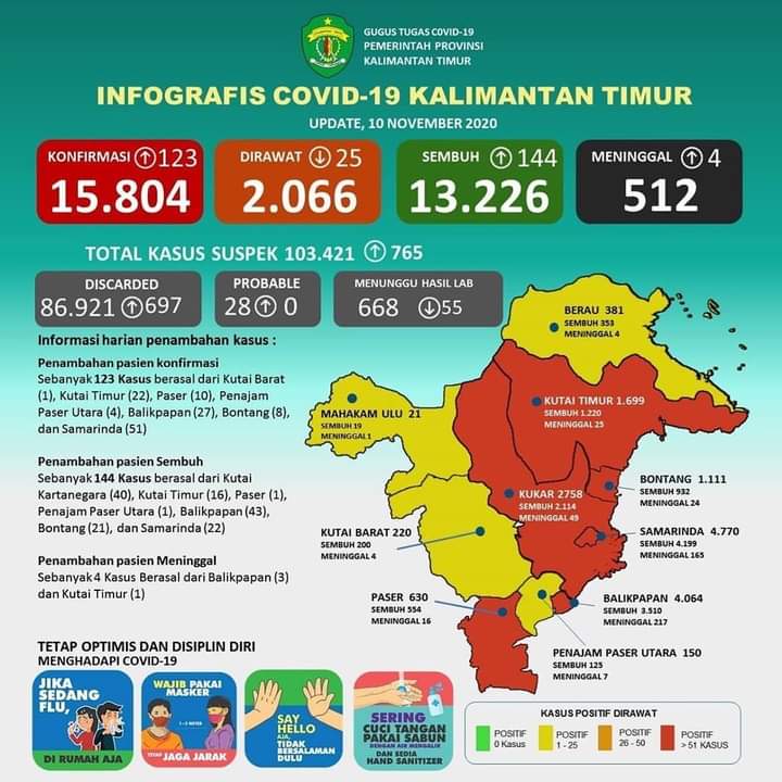 Data infografis Covid-19 yang dirilis Dinas Kesehatan Provinsi Kaltim Selasa per tanggal 10 November 2020 pukul 12.00 WITA mencatat, kasus terkonfirmasi positif Covid-19 mencapai 15.804 kasus. Tingkat kesembuhan sebanyak 13.226 kasus, pasien yang dirawat sebanyak 2.066 kasus dan total yang meninggal sebanyak 512 kasus. Discarded total sebanyak 86.921 kasus, probable sebanyak 28 kasus, sedangkan menunggu hasil lab total sebanyak 668 kasus.